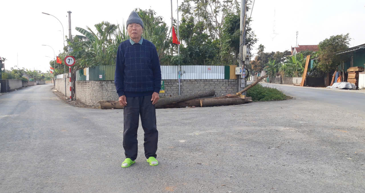 Nguyễn Kim Soa hội viên CCB xóm Minh xuân phấn khởi đứng trên diện tích đất đã hiến để mở rộng lối tách hai tuyến đường của xóm và tỉnh lộ tháng 03 năm 2025.